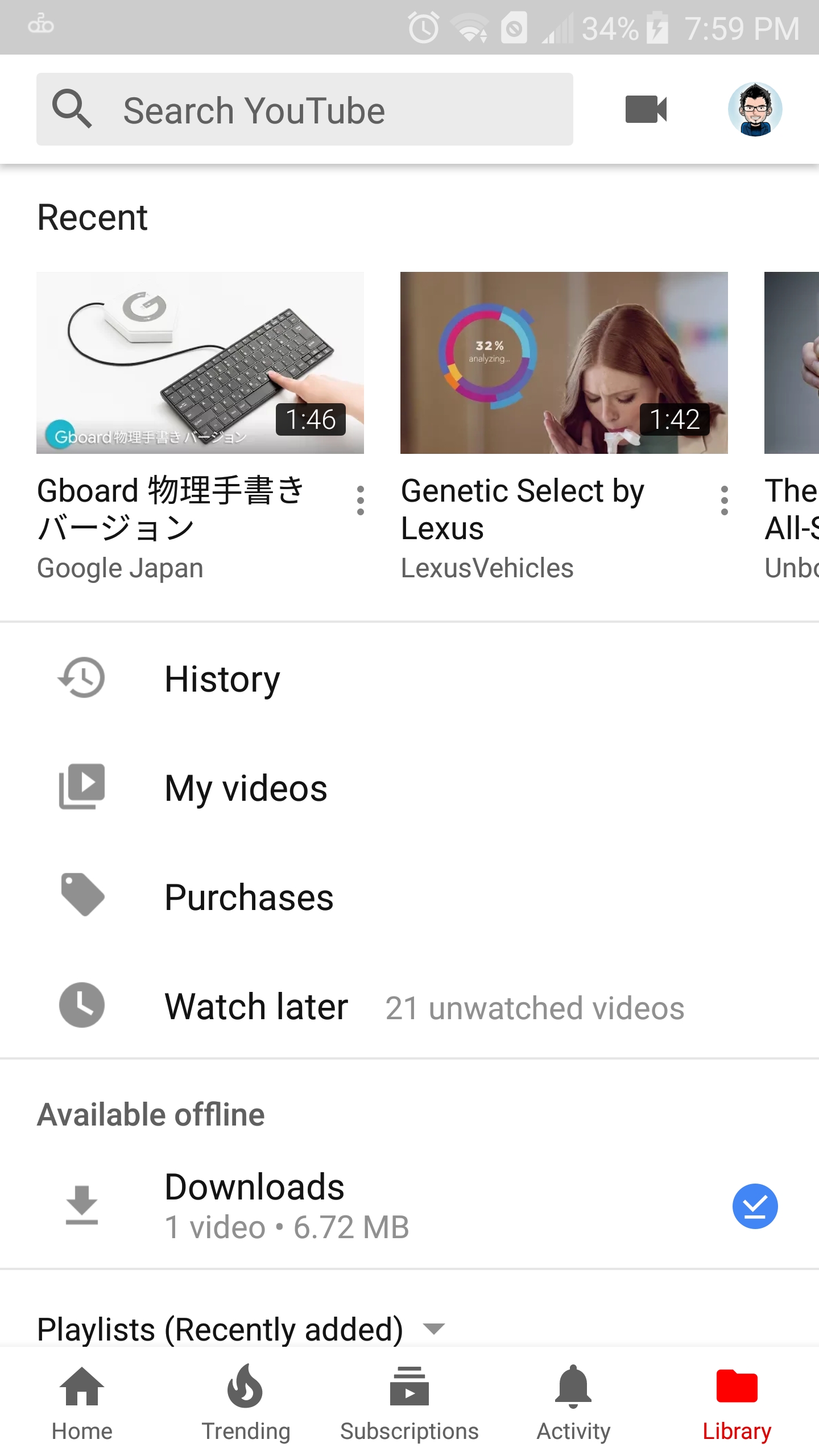 • YouTube lead UX researcher mentioned how YouTube had got smarter in suggesting what to watch. The current app suggests a vertical list of YouTube Mix only. I suggest such lists to be horizontal for more effective use of the real estate that is visible without scrolling. I also suggest a list of Playlists that includes both YouTube Mix and user-generated playlists instead of YouTube mix only. Such lists, that may include trending videos and topics, can be placed in between bigger video suggestions and should be prioritized based user behavior and recent activity.